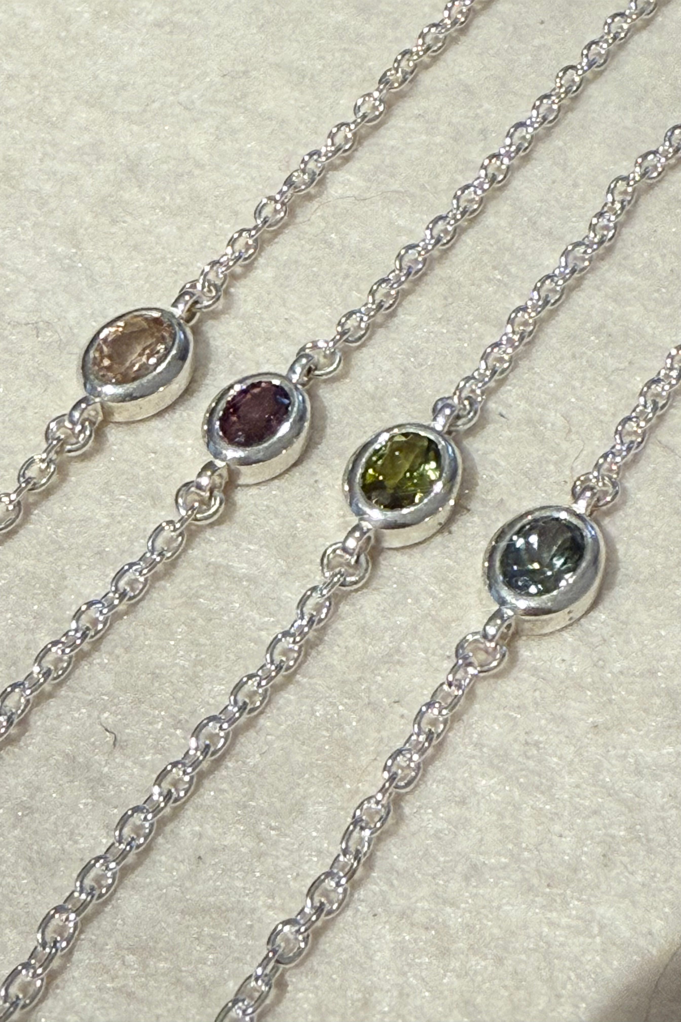 4 wunderschöne 925 Sterling Silber Armbänder mit unglaublich schönen Edelsteinen. Es stehen vier Stück zur Verfügung, von hellrosa bis blau. Das Armband ist S/M. W