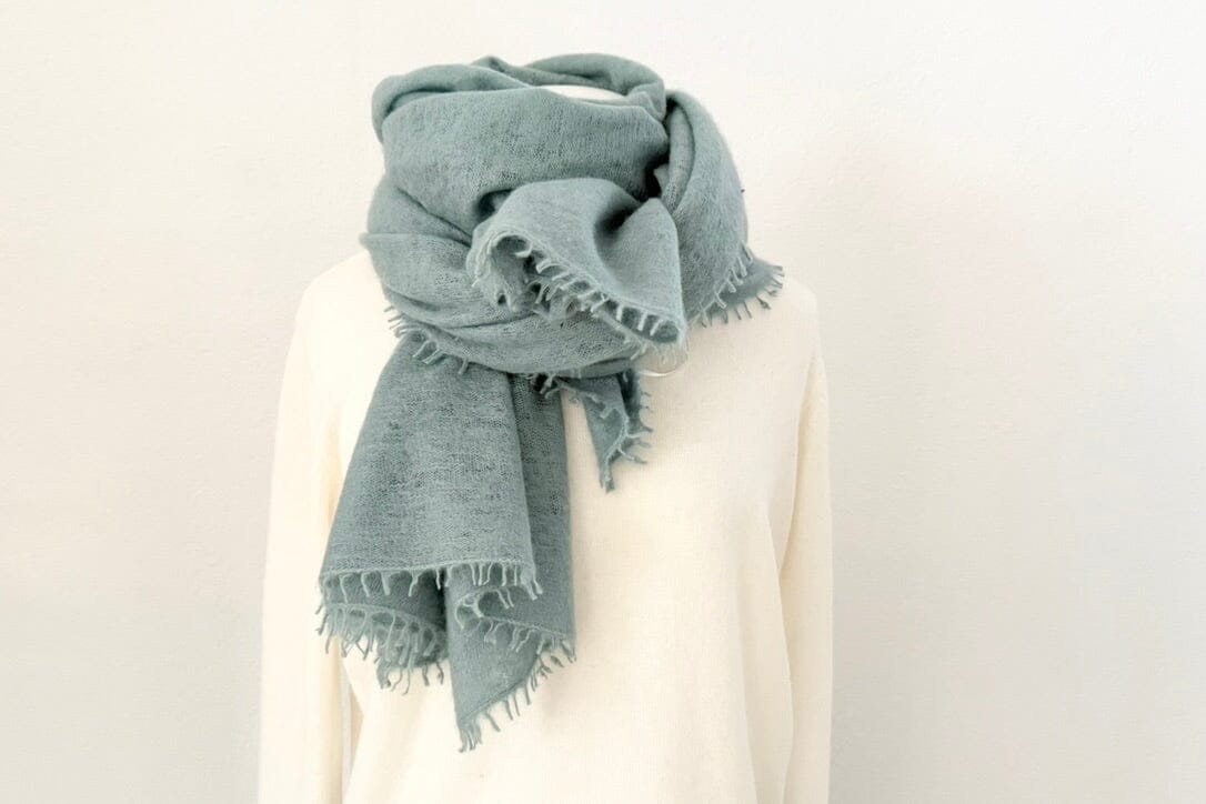 Der neue Schals hat 98x216 cm aus 100% Cashmere werden auf alten Webstöcken in limitierter Auflage exklusiv für uns in Nepal produziert.
