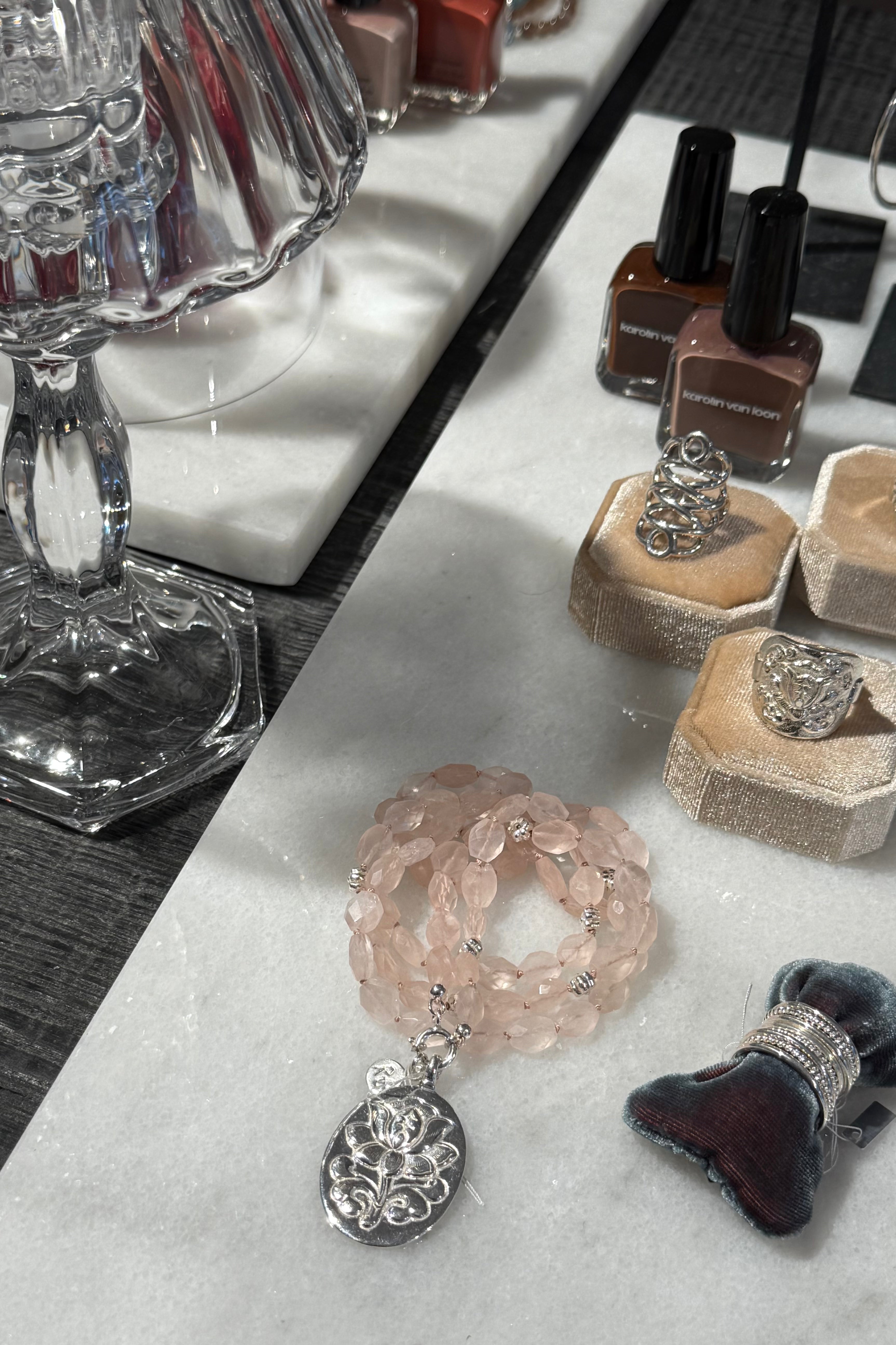 Wunderschöne in der Schweiz handgeknüpfte Rosenquarzkette, gespickt mit 925 Sterling Silber Lotusblumen. Kettenlänge 90cm. Der Rosenquarz ist facettiert.