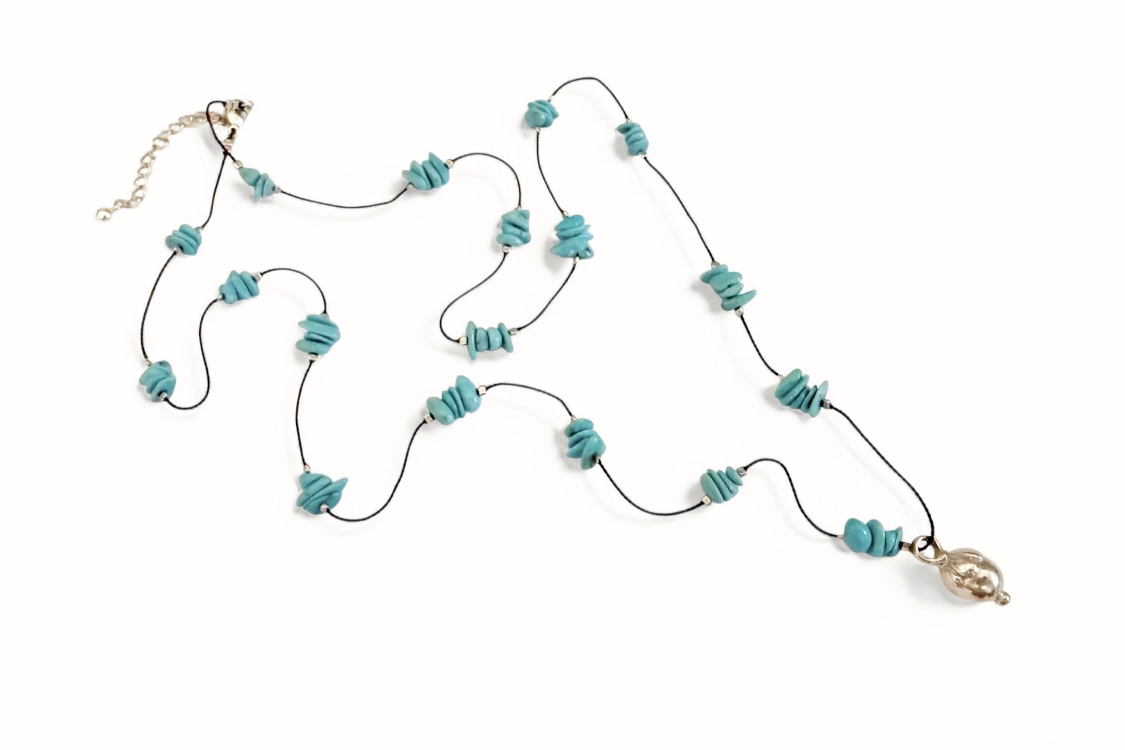 Handgemachte Baumwollkette mit kleinen 3mm eingearbeiteten Türkissteinen.. Die Anhänger ist handgemacht in Nepal und ist massiv. Kettenlänge ca. 70cm verstellbar mit Verlängerung.