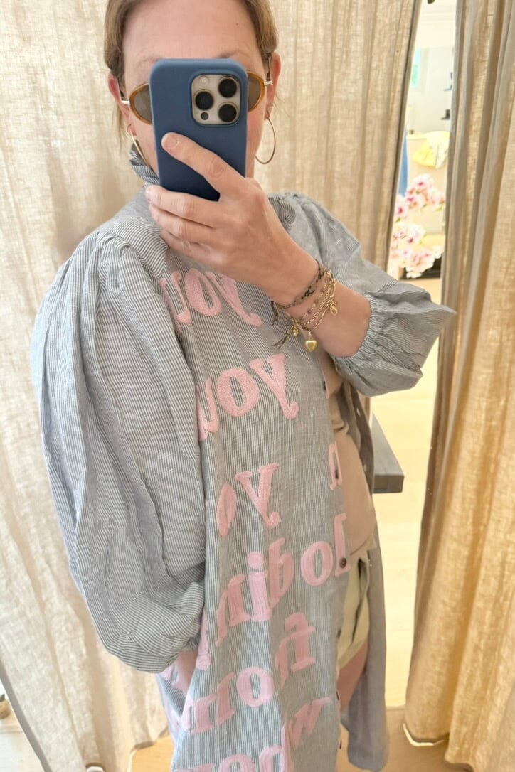 Er ist aus sehr weichen Leinen Mix gewirkt, hat ganz feine hellblau/offwhite Streifen und eine helle rosa POETRY Schrift.