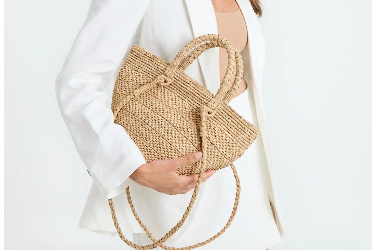 Entdecken Sie ARONA, eine kleine Tasche aus Bast, die den Korb neu interpretiert und ihm einen besonderen Platz in Ihrer modernen Garderobe einräumt.
