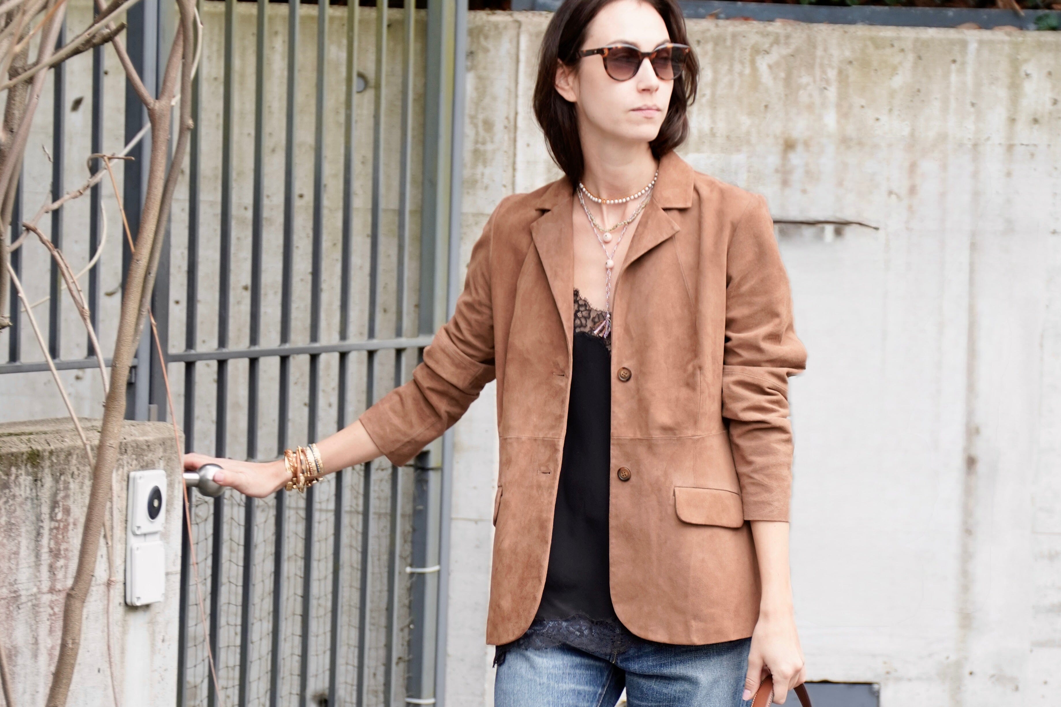 The blazer can be worn fitted or oversized. Either way, it's super soft and since I love jeans, I've combined it with my denim jumper. But you can also wear it with the matching jumper or leather leggings in chocolate, for example. The blazer is nice and long and comes over the bottom at the back.
