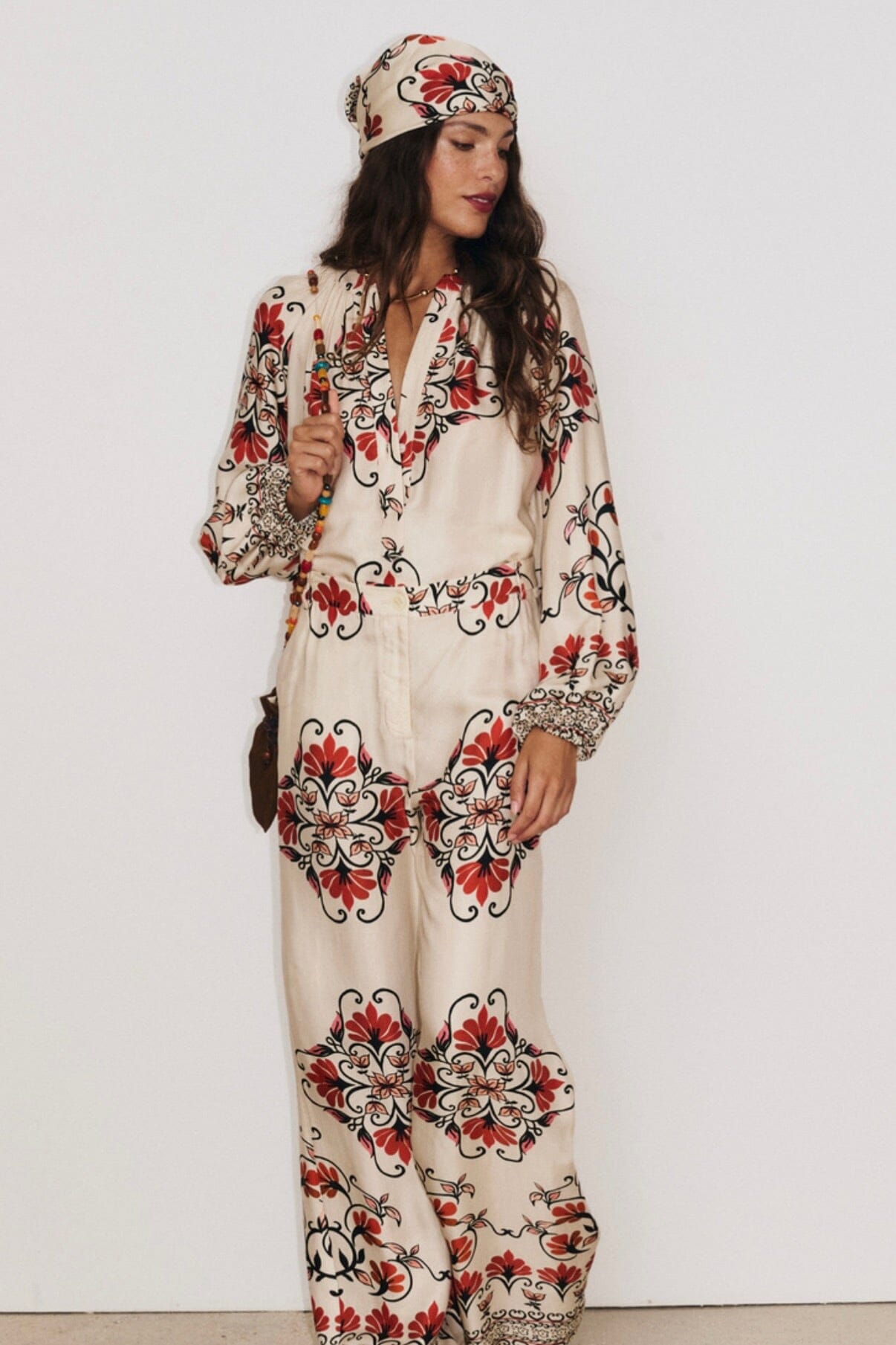 A super cool, off-white blouse, but with beautiful, feminine sleeves made of cotton with high-quality embroidery. The tunic has a certain bohemian flair thanks to the puffed sleeves with the flowers