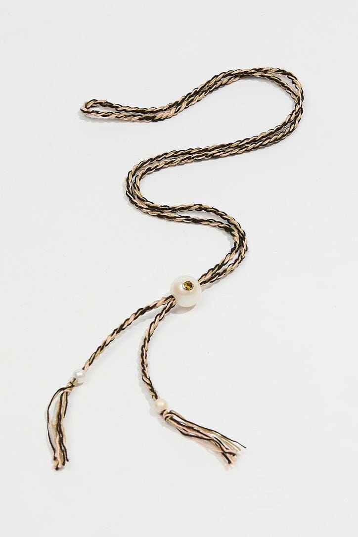 Vollständig handgefertigtes Armband der Künstlerin Tamara Taichmann. Die cinnamon - farbige Baumwoll-Schnüre sind gezöpfelt und von einem Tiger Eye verziert in dessen Mitte ein Citrin mit einer 14K Gold Fassung sitzt.