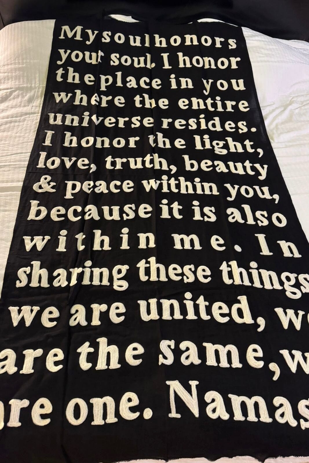 Ein super schöner 100% Wool Pashmina Classic Scarf. Warm, super weich und mit einem schönen Spruch in flieder bestickt. Ein richtiges Statement Piece über deine Kleider im Frühling/Sommer oder im Herbst/Winter als Schal.